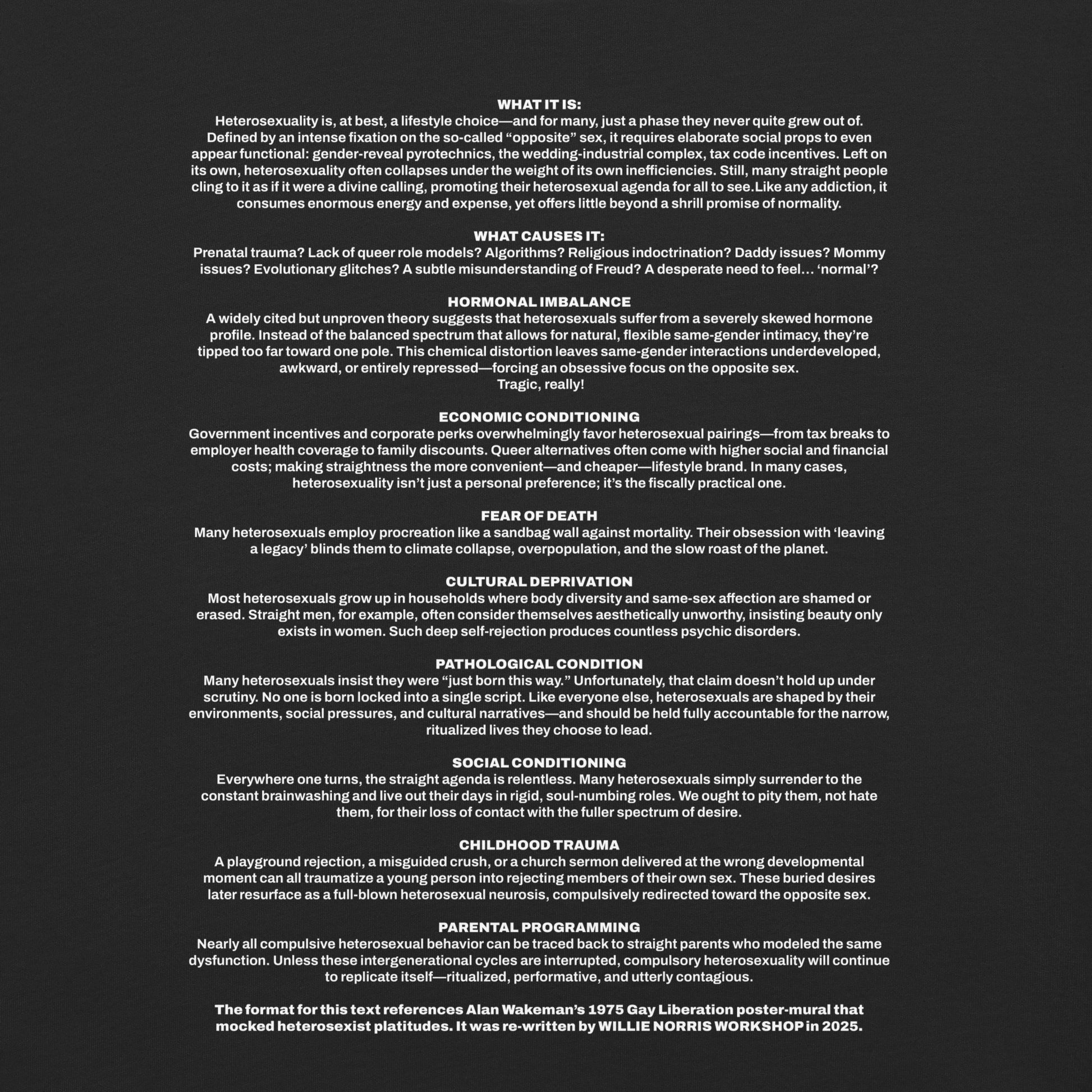 Still asking after all these years. The original inspiration and rather direct reference point for this tee is Alan Wakeman's 1975 gay liberation poster mural. When I first released it in 2018, the text was lifted verbatim onto the front and back. This new version posits the same question, while the back body language was re-written by me in 2025. This shirt still cracks me up.